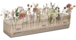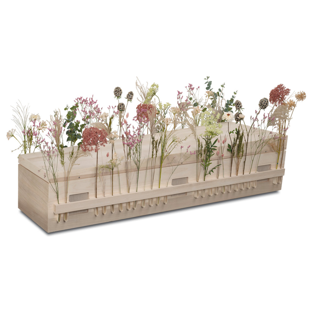 De Fiori, een zeer eigentijdse massief populieren kist. Het design van deze kist laat ruimte om er zelf een creatieve draai aan te geven! Aan beide zijkanten bevindt zich een lange doorlopende greep, die voorzien zijn van kleine openingen die naar eigen idee gevuld kunnen worden met bv. bloemen of mooie takjes. Onder de gaatjes in de greep zijn lussen gemaakt. om er voor te zorgen dat alles op gelijke hoogte geplaatst kan worden.