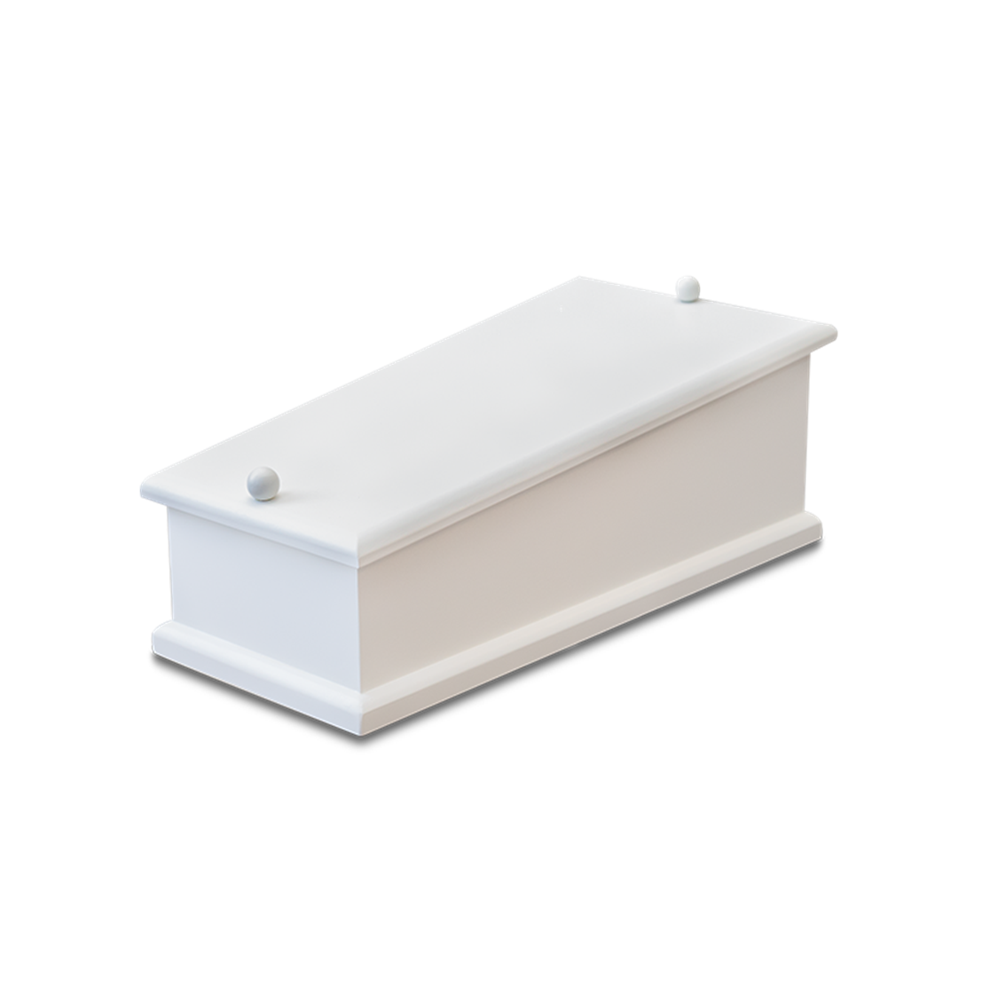 Dit wit gelakte kinderkistje is mooi en tijdloos vormgegeven en is verkrijgbaar in verschillende maten.  De kleinste maten zijn geschikt voor prematuur geboren baby’s. De oplopende maten zijn geschikt tot ongeveer 11 jaar.