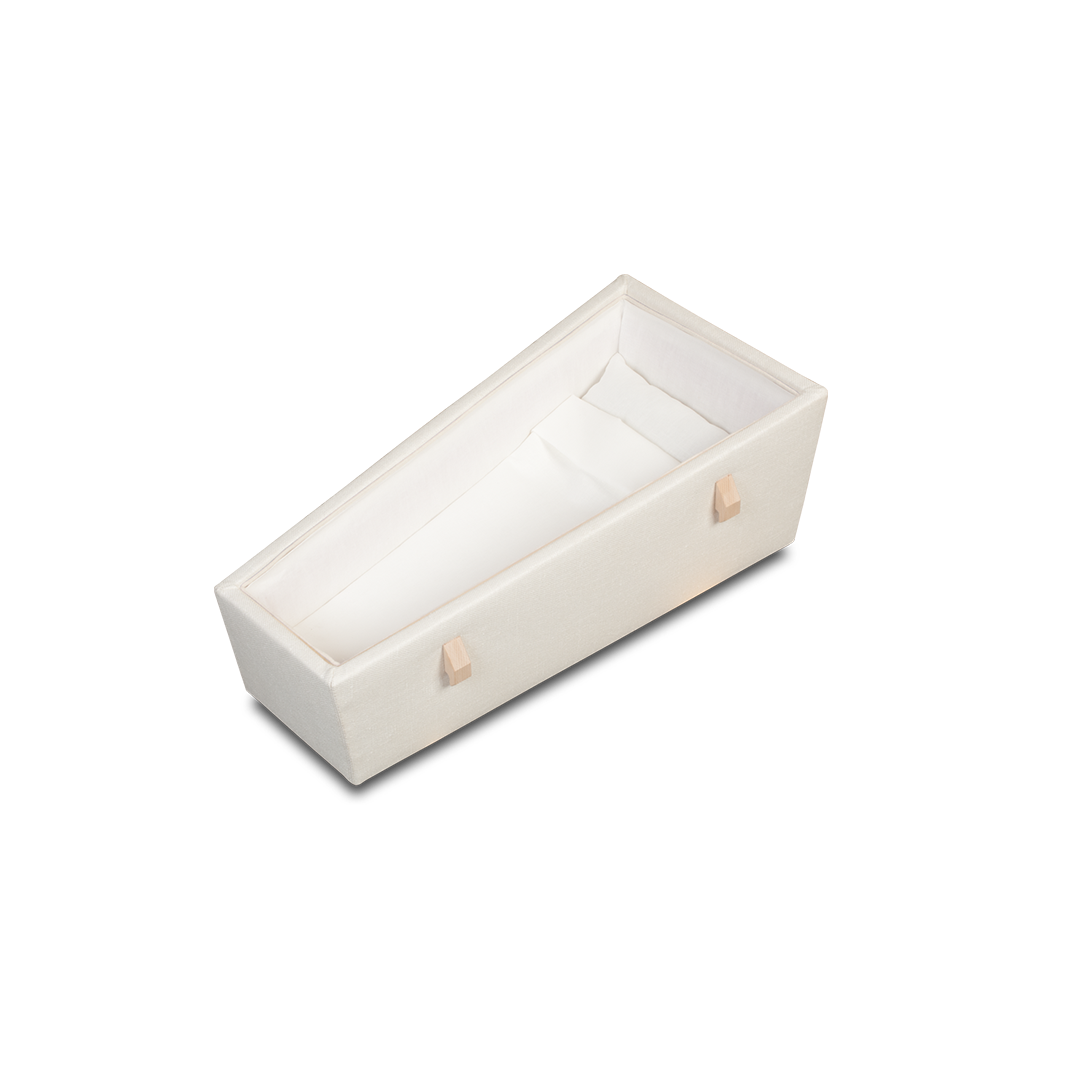 Het Linum uitvaartkistje is gemaakt van populierenhout en aan de buitenzijde geheel gestoffeerd met Belgisch Linnen. Dit geeft het kistje een mooie en zachte uitstraling. Het kistje is voorzien van touwgreepjes aan de zijkanten en hiermee wordt ook het kistje gesloten.