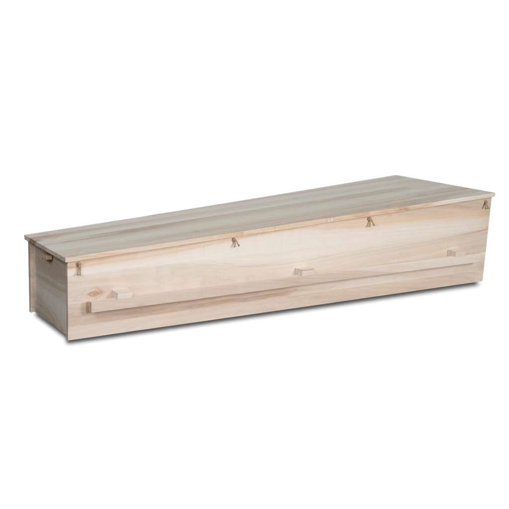 Onze natuurkist is 100% biologisch afbreekbaar en licht van gewicht. De natuurkist is gemaakt van populierenhout en bij de productie is geen metaal gebruikt.  De kist wordt gesloten door middel van touwsluitingen. De bekleding is in de kist geknoopt.