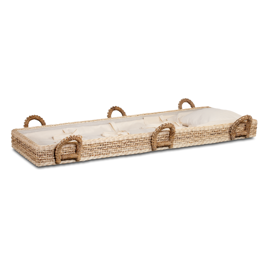 De Abaca heeft mooie gevlochten handgrepen. De opbaarplank is voorzien van een stevige vlakke houten bodem en is voorzien van een wade in linnen natuur.