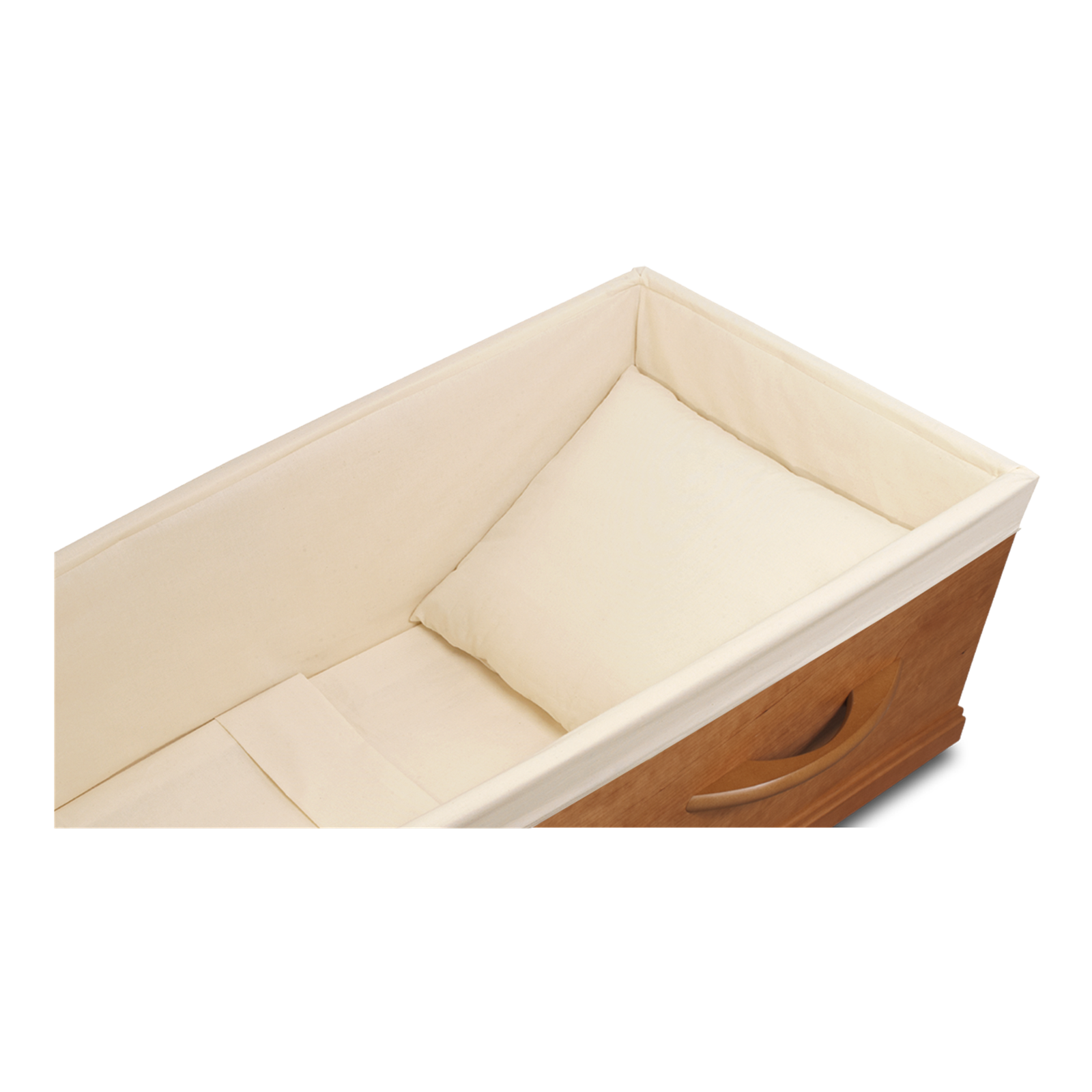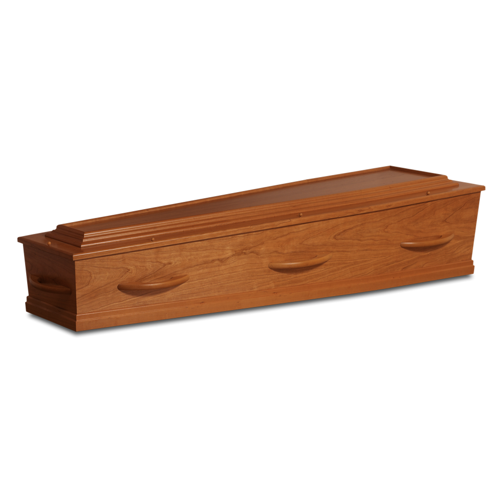 De uitvaartkist 1-47 kersen is voorzien van bijpassende houten grepen en tevens verkrijgbaar met een vlak deksel: 1-40 kersen.