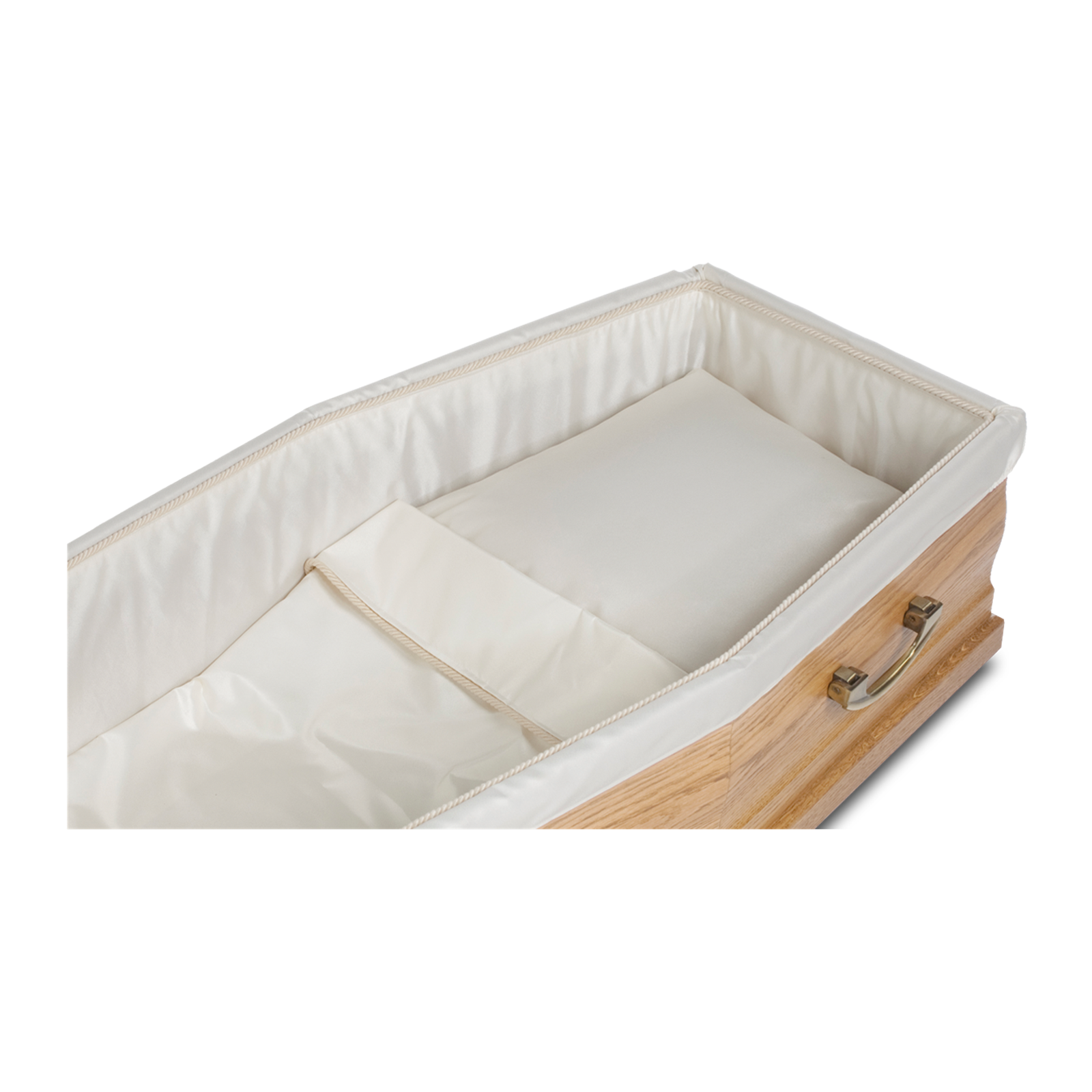 Deze massief eikenhouten uitvaartkist is geprofileerd en voorzien van een kroondeksel. De grafkist is blank gelakt en voorzien van bronzen 3207 grepen en square schroeven.