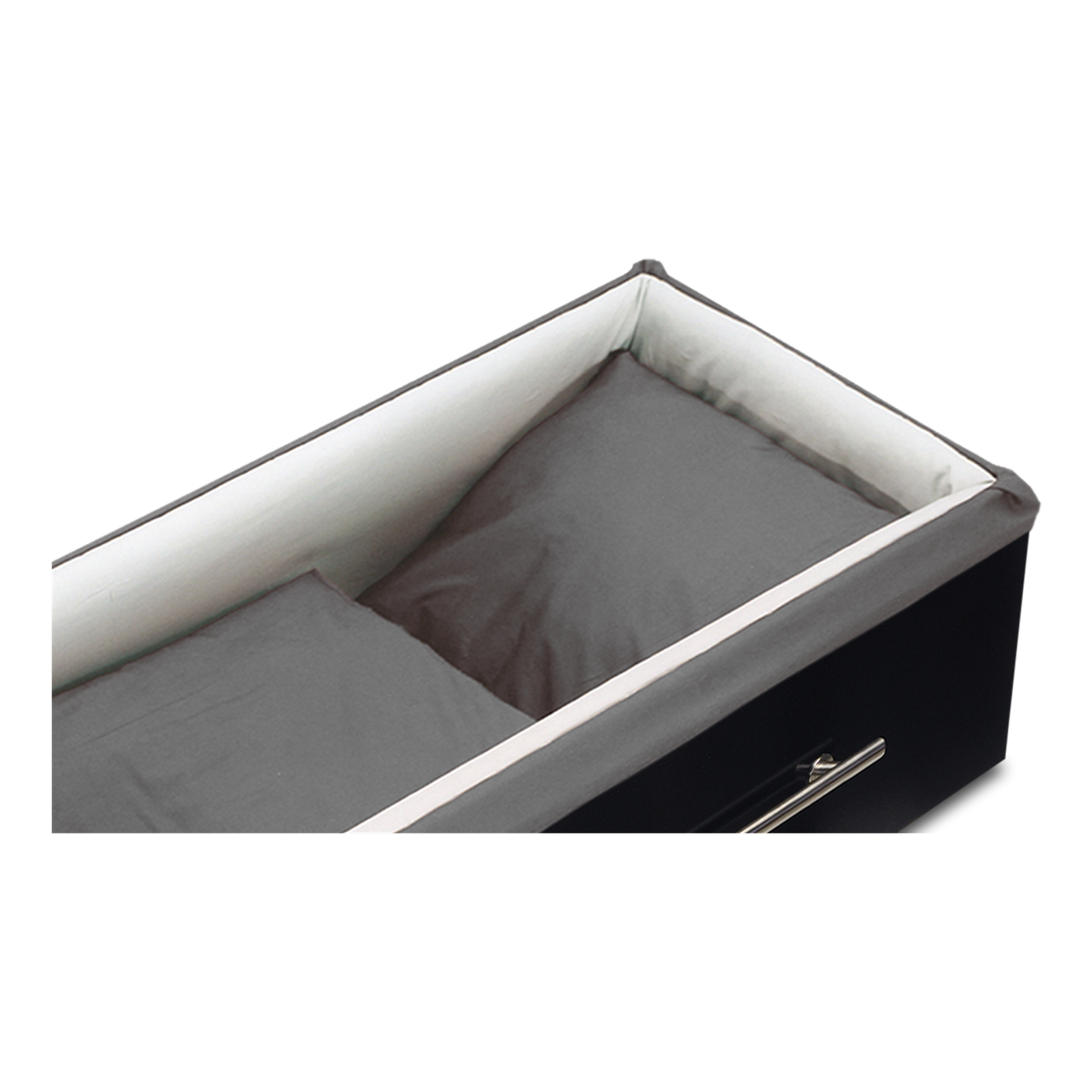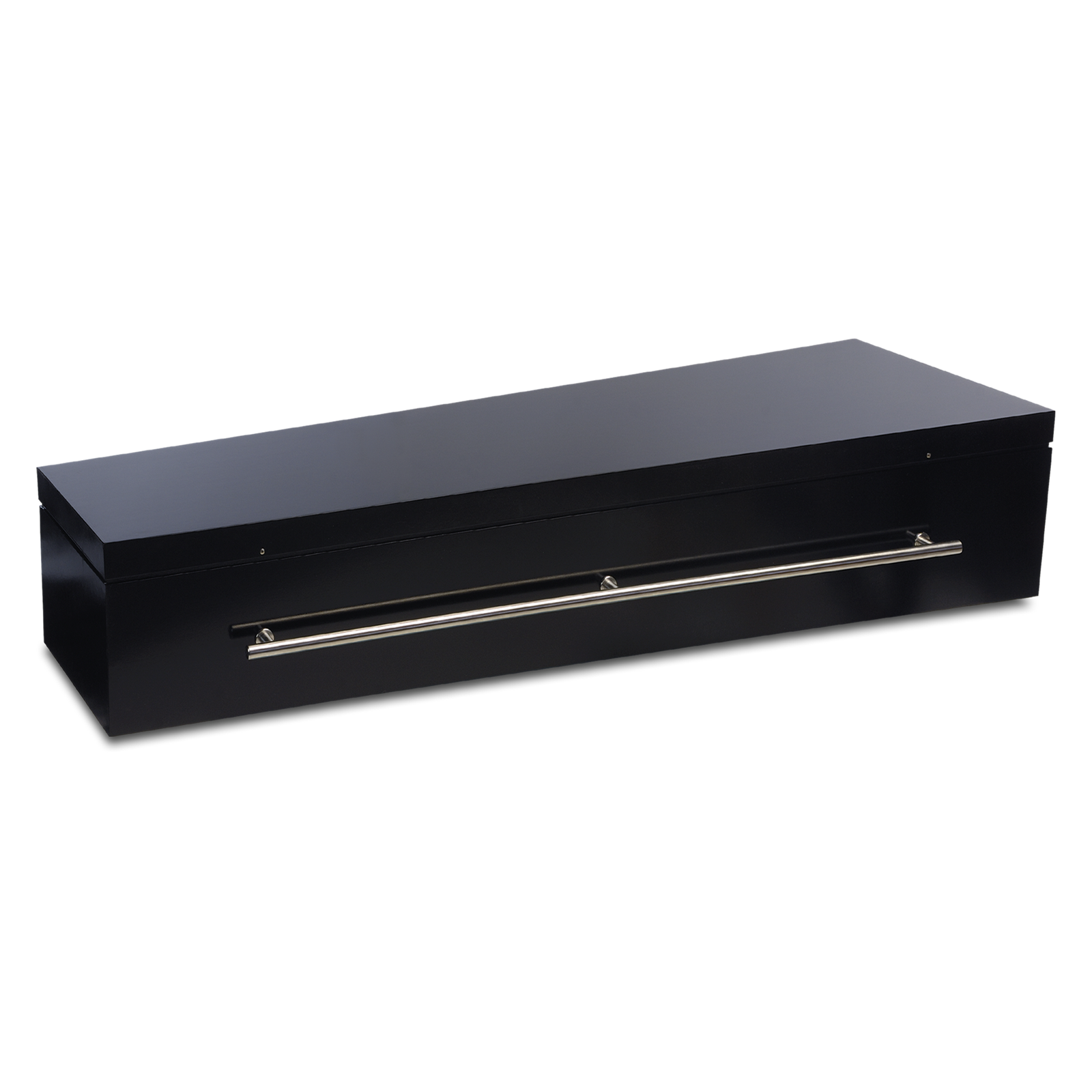 De La Linea Zwart is een mooie modern vormgegeven uitvaartkist, die in hoogglans zwart is gespoten. Langs de zijkant zijn lange RVS buisgrepen geplaatst. De uitvaartkist wordt gesloten door middel van 3 RVS parkers langs de lange zijdes.